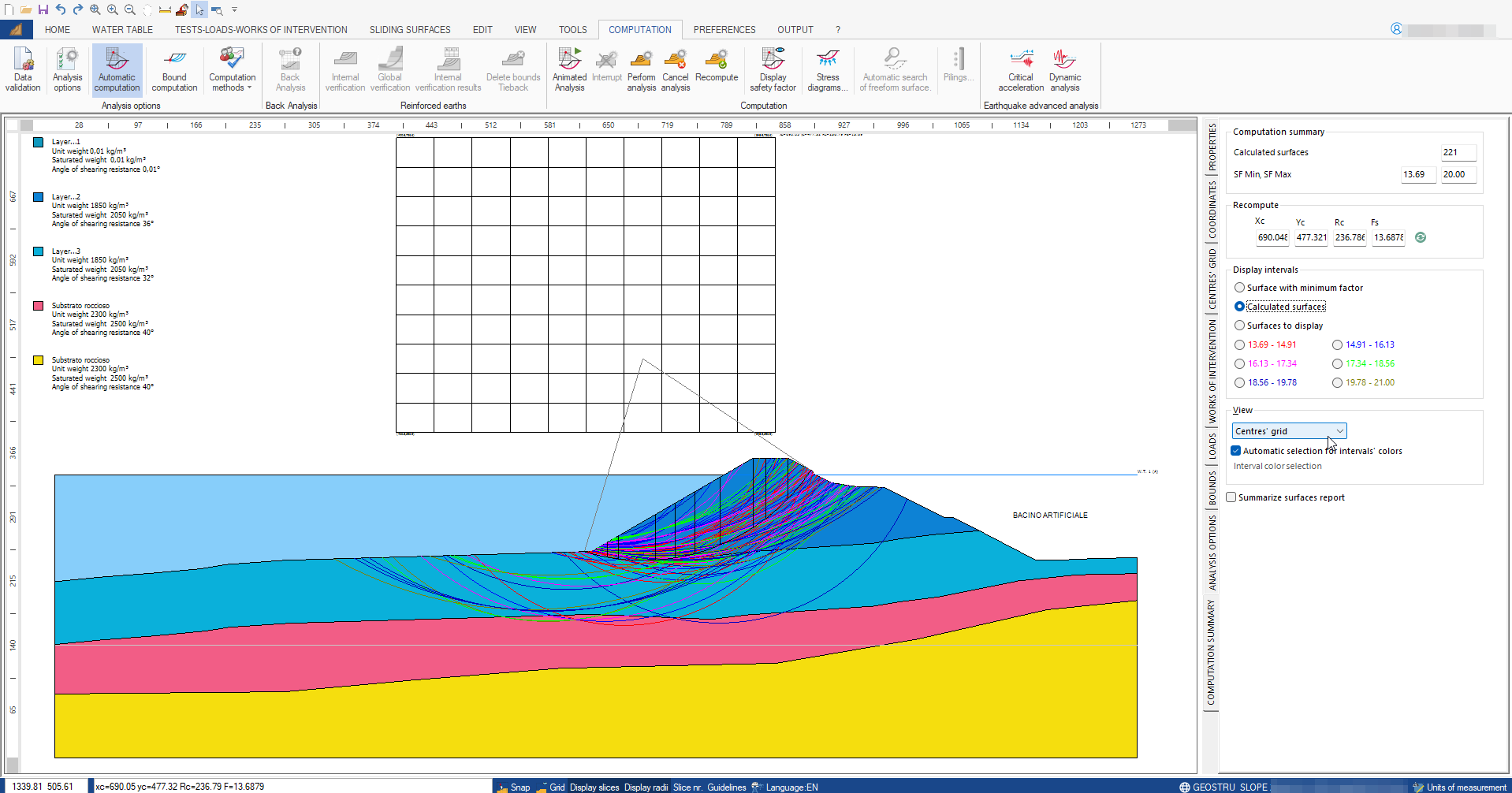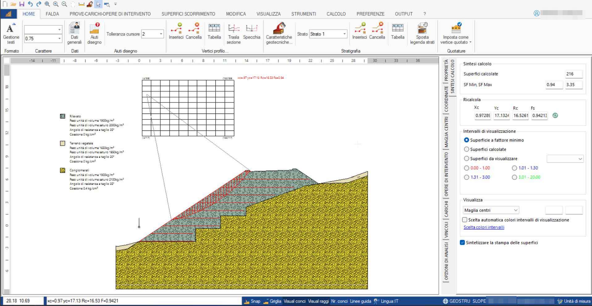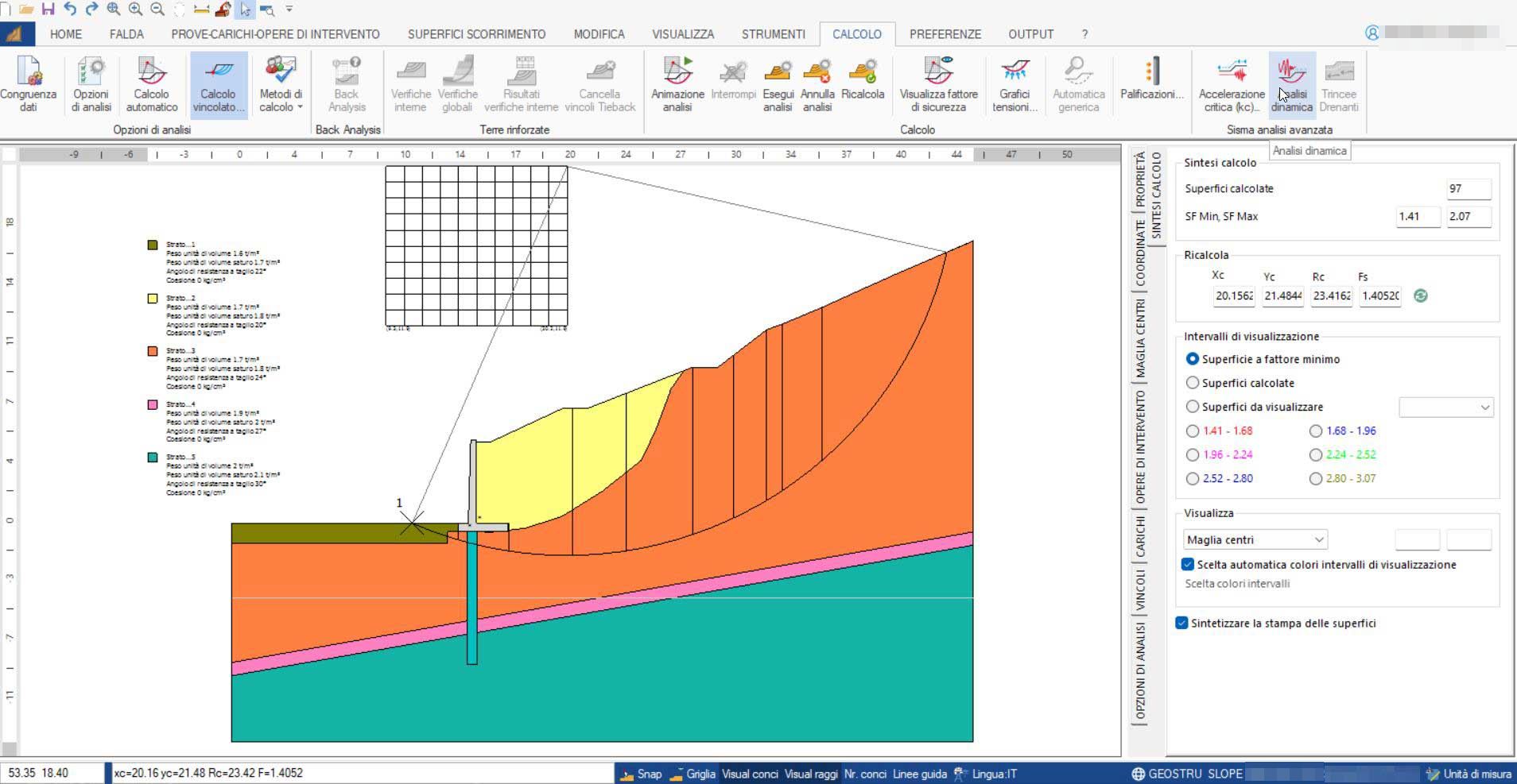 - Visualizzazione a colori di tutte le superfici di scorrimento esaminate suddivise per fattore di sicurezza (ad ogni colore corrispondono fattori di scorrimento compresi in un fissato intervallo)